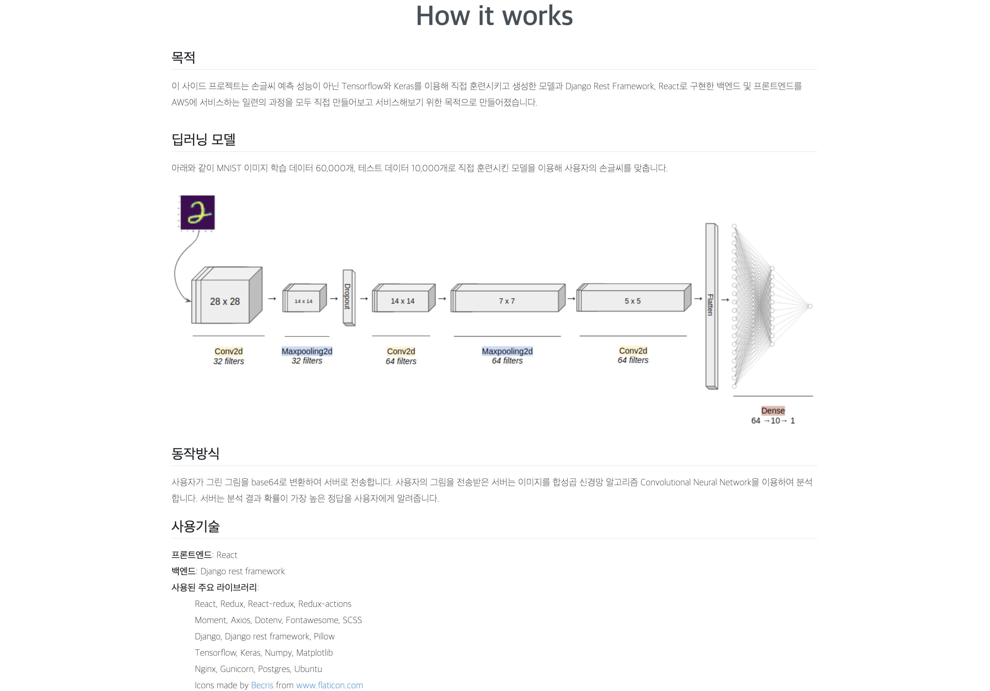 이 사이드 프로젝트는 손글씨 예측 성능이 아닌 Tensorflow와 Keras를 이용해 직접 훈련시키고 생성한 모델과 Django Rest Framework, React로 구현한 백엔드 및 프론트엔드를 AWS에 서비스하는 일련의 과정을 모두 직접 만들어보고 서비스해보기 위한 목적으로 만들어졌습니다. yarn build하다가도 메모리 부족 오류가 발생하는 RAM 512mb 서버에서 돌고 있습니다.