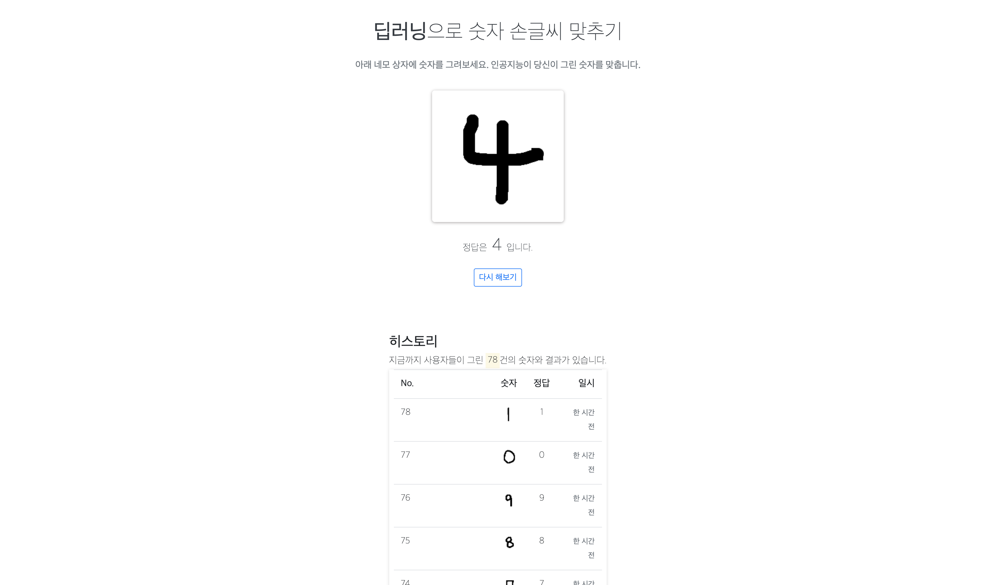 이 사이드 프로젝트는 손글씨 예측 성능이 아닌 Tensorflow와 Keras를 이용해 직접 훈련시키고 생성한 모델과 Django Rest Framework, React로 구현한 백엔드 및 프론트엔드를 AWS에 서비스하는 일련의 과정을 모두 직접 만들어보고 서비스해보기 위한 목적으로 만들어졌습니다. yarn build하다가도 메모리 부족 오류가 발생하는 RAM 512mb 서버에서 돌고 있습니다.