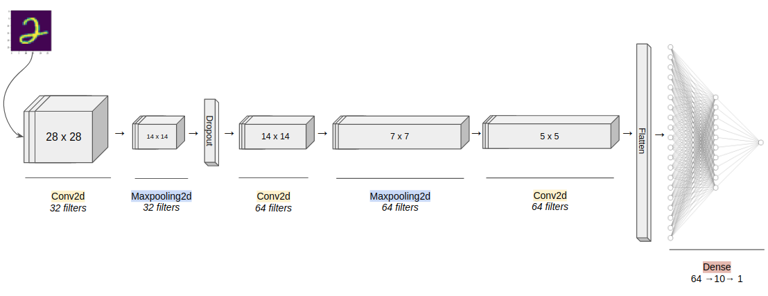 아래와 같이 MNIST 이미지 학습 데이터 60,000개, 테스트 데이터 10,000개로 직접 훈련시킨 모델을 이용해 사용자의 손글씨를 맞춥니다.